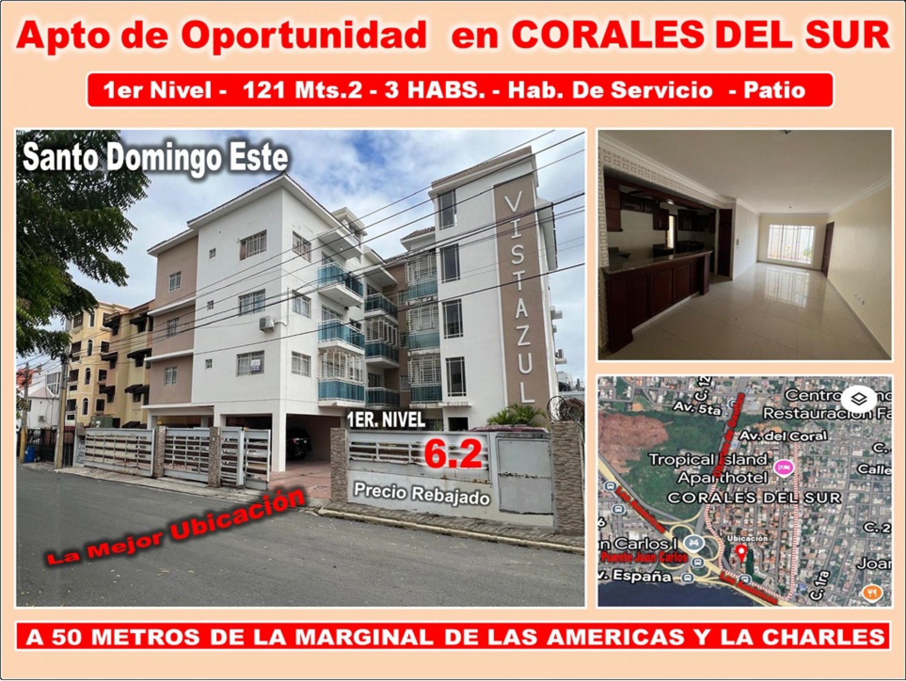 EL APTO ESTA UBICADO EN LA MEJOR ZONA DE CORALES DEL SUR, EDIFICIO VISTAZUL CON UNA MUY BUENA CONSTRUCCION, OCUPANDO EL 1ER. NIVEL DEL EDIFICIO, CON UN PEQUEÑO PATIO EN LA PARTE DE ATRÁS.
