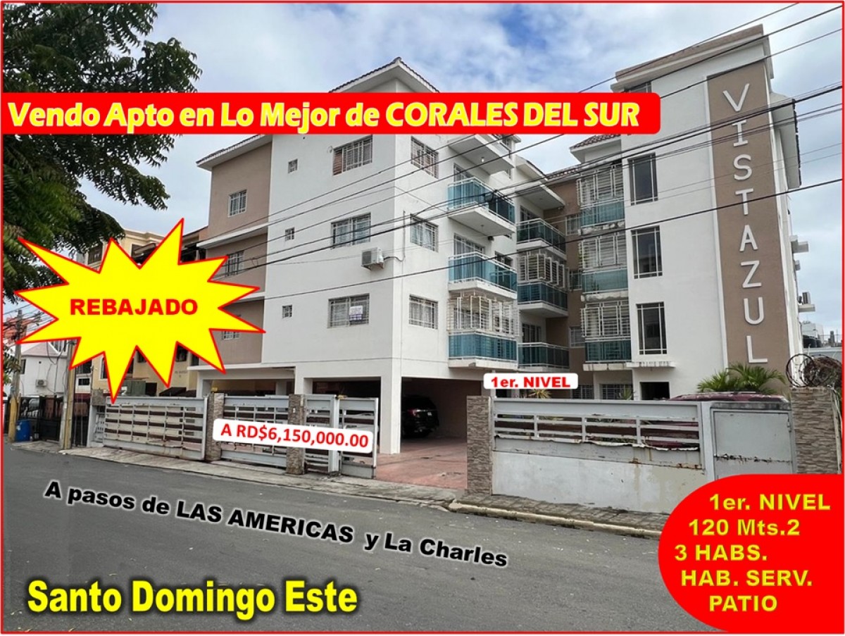 Vendo Apto en CORALES DEL SUR, 1er. Nivel, 3 HABS., 120 Mts.2, Patio, REBAJADO