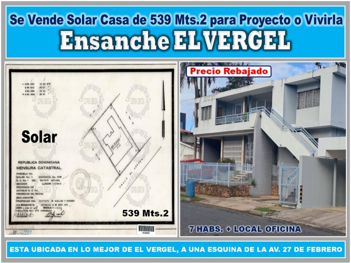 VENDO SOLAR CASA PARA DEMOLER O VIVIRLA EN EL VERGEL, 539 Mts.2, A 1 ESQ. DE LA 27 DE FEBRERO