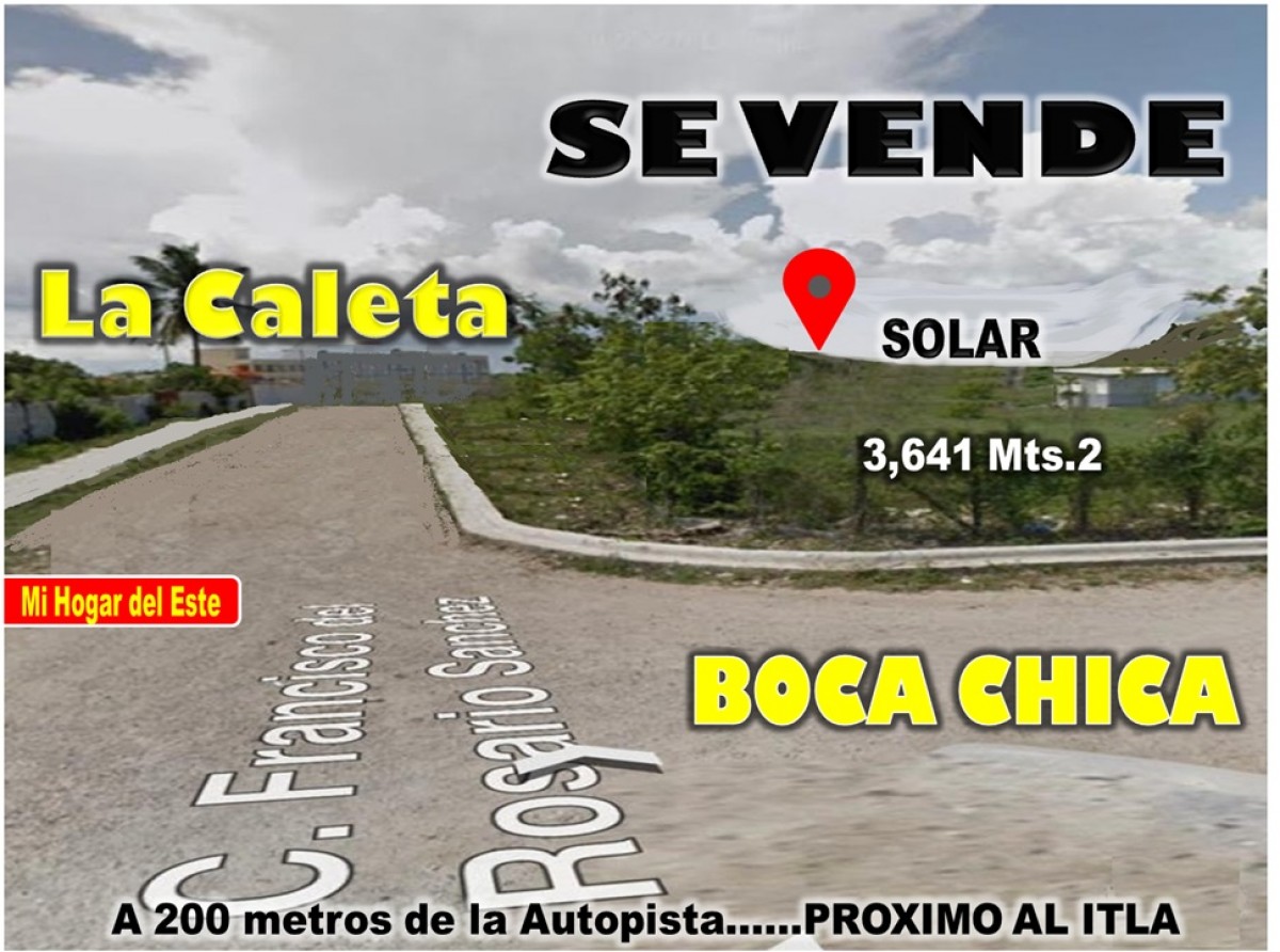 El Solar está ubicado en la Calle Francisco del Rosario Sánchez, a unos 400 metros de LA AUTOPISTA y próximo al Instituto Tecnológico de Las Américas (ITLA) en Mi Hogar del Este, LA CALETA.