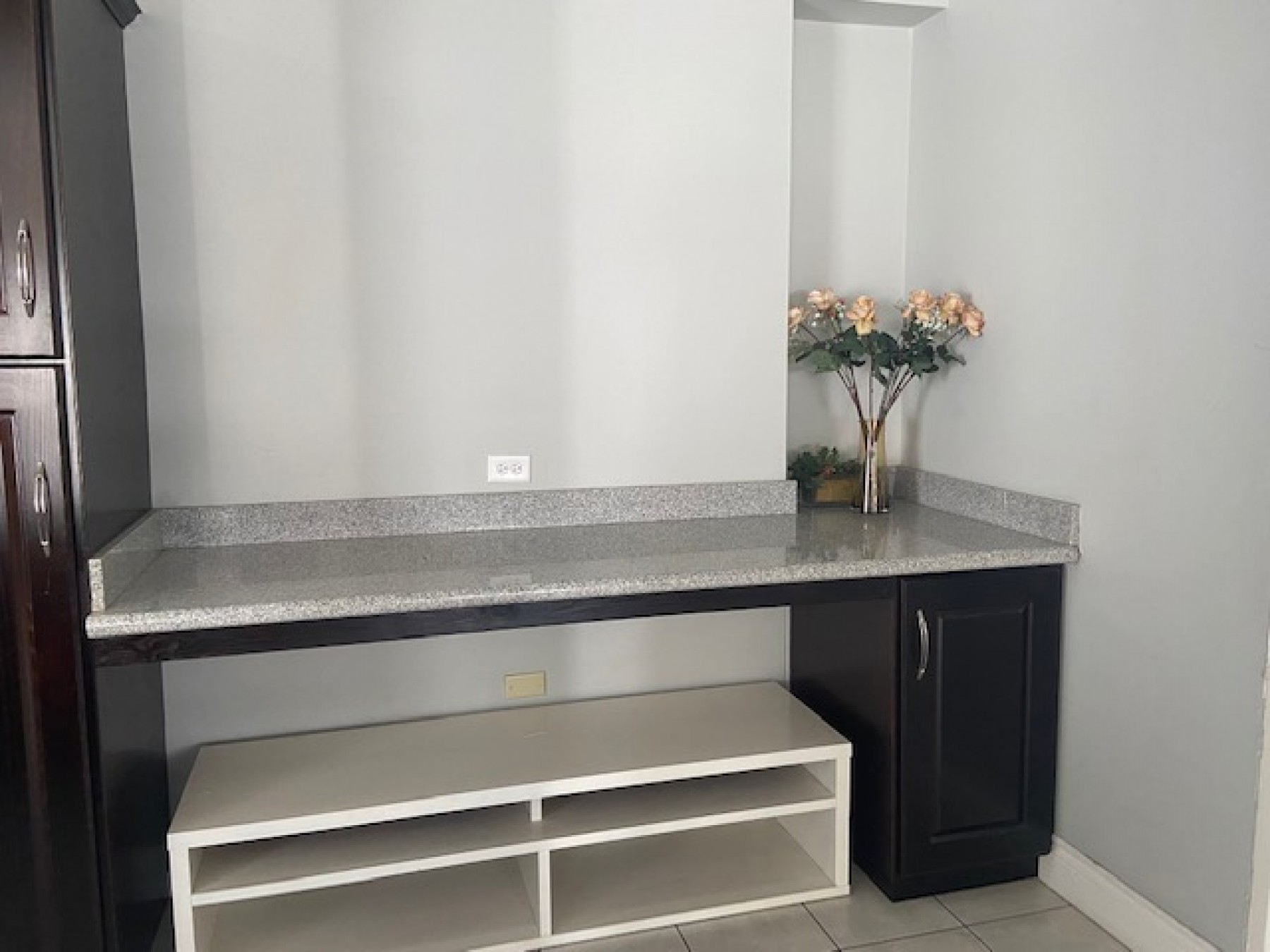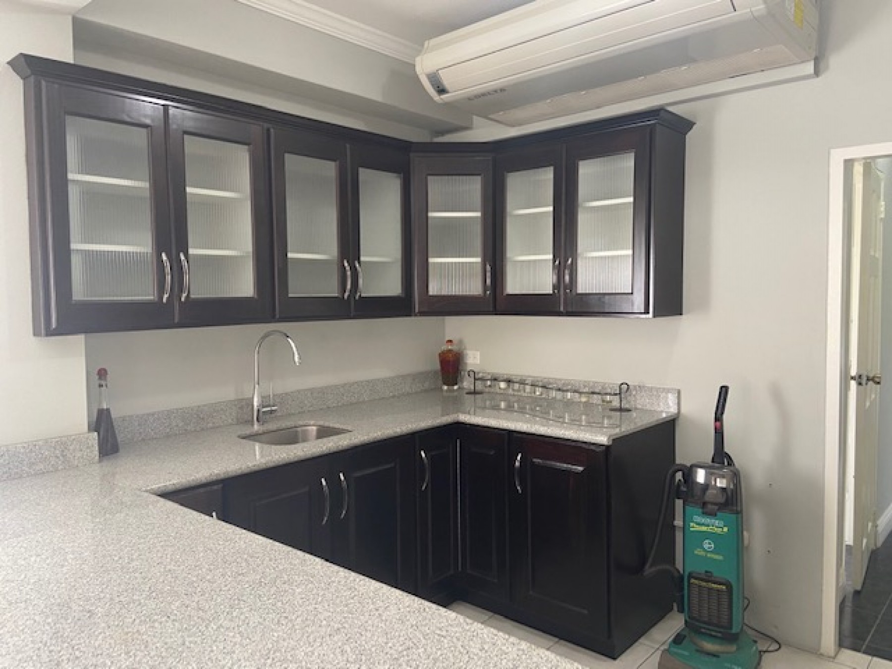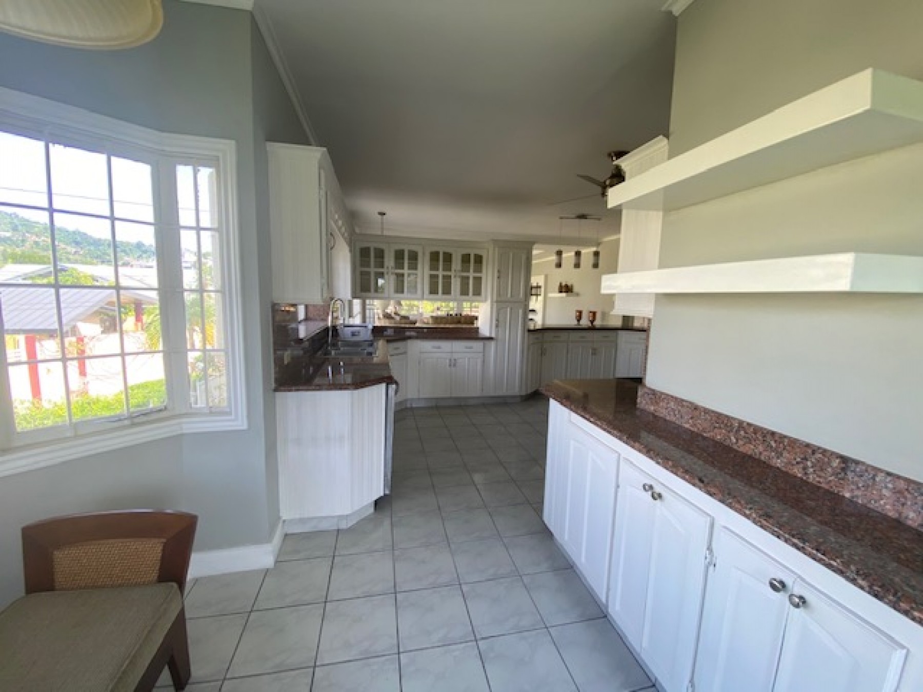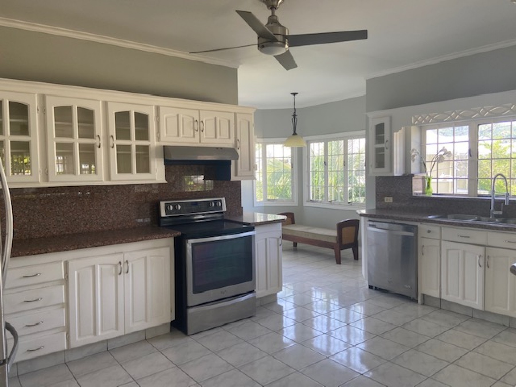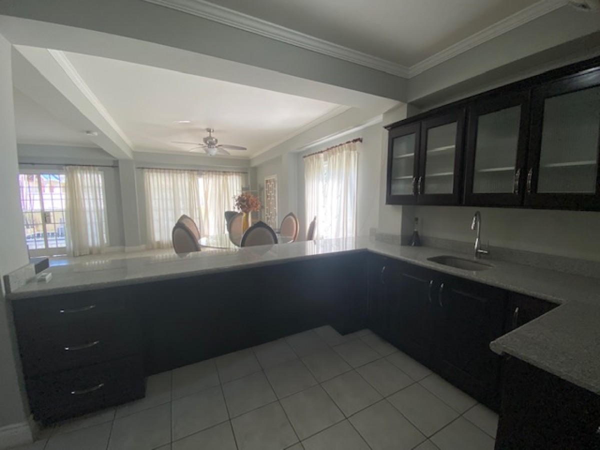 Hay dos cocinas. Arriba tiene una gran cocina abierta con comedor independiente y sala de estar que se abre a un espacioso balcón cerrado con vista a la piscina.